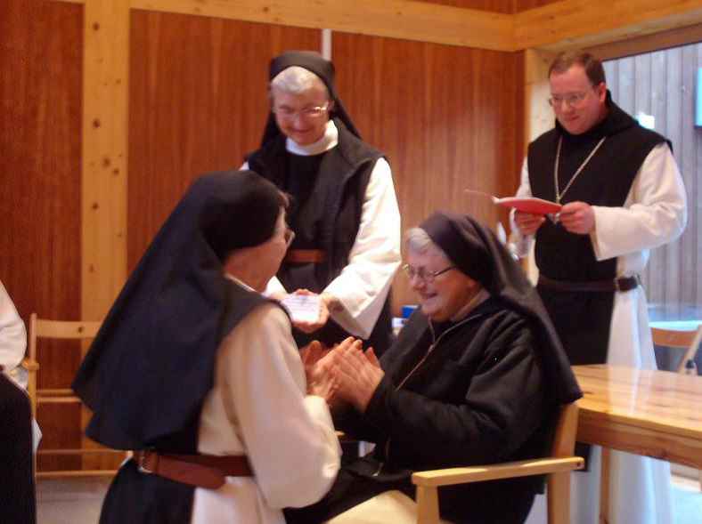 Tautra’s prioress for the first 13 years, sr. Rosemary Durcan (kneeling), promises obedience to the newly elected prioress, sr. Gilkrist Lavigne. Standing behind her are Sr.Gail Fitzpatrick, who was abbess of Our Lady of the Mississippi when Tautra was founded, and abbot Richard Purcell of Roscrea Abbey in Ireland. He is Tautra’s Father Immediate, and as such was President of the election at Tautra Mariakloster.