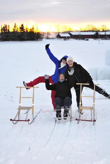 One of the joys of an early snowfall was introducing our newcomers to the Norwegian sled called a «spark». "Spark" in Norwegian means to kick, and one propels the sled forward by standing on the runners behind the handlebar, and kicking against the snow on the road. The seat is actually for your groceries or whatever you want to carry from one place to another. In places like Røros, where they have snow 9 months of the year, people use more sparks than cars and at the hotels there is a "sparking lot."