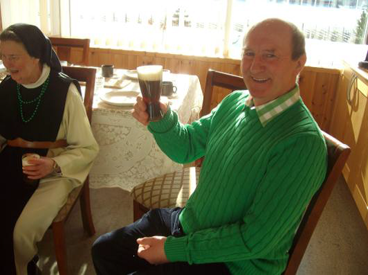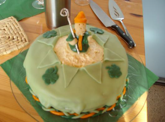 Vår irske kapellan p.Anthony kan regne med ekte irsk kaffe på St Patricks Dag. Runa laget en bløtkake med marsjipan St Patrick!