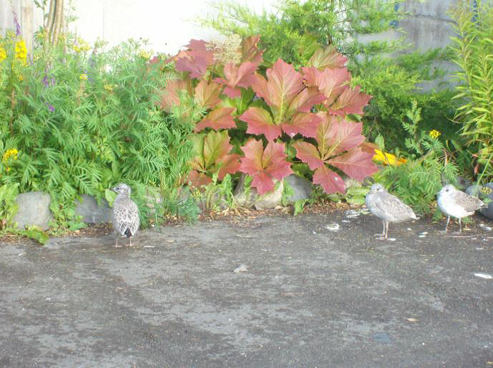 Tre måkeunger vokste opp i vår innkjørsel—her foreviget som tenåringer.