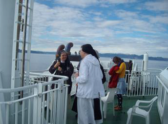 Etter novisemesterkonferansen fikk vi noen få dager til å være sammen med våre gjester fra moderklosteret Our Lady of the Mississippi Abbedi; M Rebecca og Sr Grace. Sistnevnte dukket seg i fjorden og erklærte den ikke like kald som Lake Michigan. Begge søstrene prøvde å fiske fra broen, men all torsken måtte ha spist annetsteds den dagen.