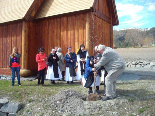 I fjor høst var vi invitert til kirkeinnvielsen av Hindrem stavkirke som ble reist av en lokal forening på den andre sida av fjorden. Vi måtte unnskylde oss fordi vi hadde det for travelt til å ta en 6-timers tur-retur på en søndag. Vi ble da invitert på nytt til et vårbesøk for sammen å kunne plante et eiketre som skal stå i de neste 1000 årene som tegn på vårt vennskap. Så 11.mai, dagen før årsdagen for vår egen kirkevigsel, kjørte vi sørover til Trondheim og tok ferjen til "den andre siden."