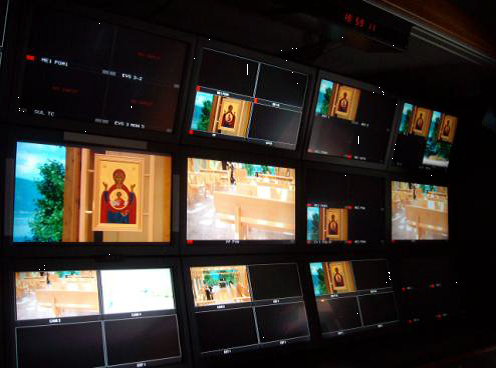 Etter opptaket ble vi invitert til å se direktørens kontor med omtrent 30 skjermer med bilder av vår messe. Det kringkastes 8.september kl. 11 eller finn oss på www.tv.nrk.no