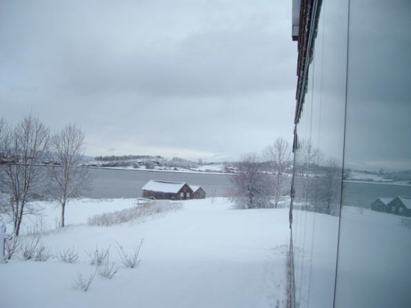 Sticking one’s head out the door behind our little chapel affords an interesting view towards our boathouses and the Tautra ruins across the bay, reflected in the large windows behind our altar.