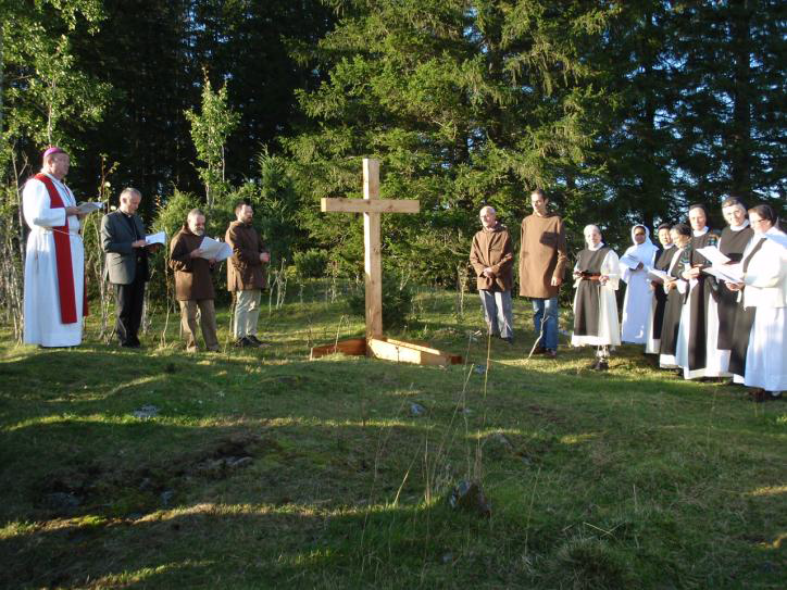 September 14, the Feast of the Triumph of the Cross, was the occasion of the official opening of Munkeby Mariakloster, only an hour’s drive north of us. The date was chosen because the Feast was the day the General Chapter opened at Cîteaux, the motherhouse, in France, through the centuries. By choosing Sept.14, Dom Olivier, the abbot of Cîteaux, and the four founding monks wanted to say that Munkeby is of importance for the whole Order. The founders, Joël, Cyrille, Bruno and Arnaud, invited the nuns of Tautra Mariakloster and a few close friends to a 12.00 Mass in their new house. The house is the perfect size for the four of them, fits into the landscape, and its cathedral ceilings give it a lightness particularly appropriate to the chapel. This house will become the guesthouse when enough funds are raised to build the permanent monastery in the adjacent field, and the monks move over there. (Sound familiar? We know the routine!) During the Mass, Dom Olivier preached on the significance of the Feast for the Cistercian order and for Munkeby, citing a letter of St Bernard, "our Order is the Cross." The opening Mass was followed by a picnic lunch for the 30 or so present, provided by us sisters who are just delighted to have a brotherhouse so close to us and so soon after our own foundation. (We know how to do picnics!) Many others who wanted to be part of this historic event were invited to 5.00 vespers. After the psalmody we processed to the edge of the woods where the foundation cross was set up and blessed. It had been raining all week, but at this moment the sun came out and God gave us perfect weather.