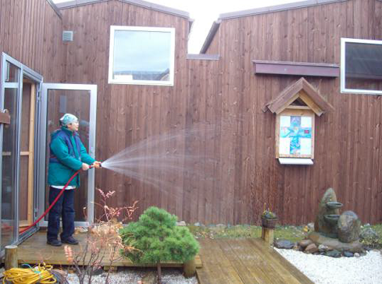 Once a year we practice a fire drill, just in case. Sr Eleanor opens the fire hose in the Zen garden.